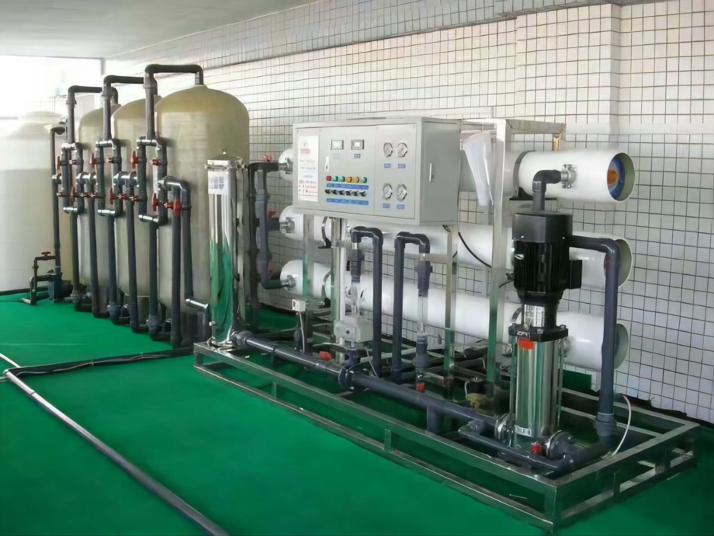 ②進(jìn)水→原水箱→原水泵→多介質(zhì)過濾器→活性炭過濾器→軟化過濾器→保安過濾器→高壓泵→RO反滲透→純水箱→拋光混床系統(tǒng)→出水口(電導(dǎo)率≤0.2μs/cm);